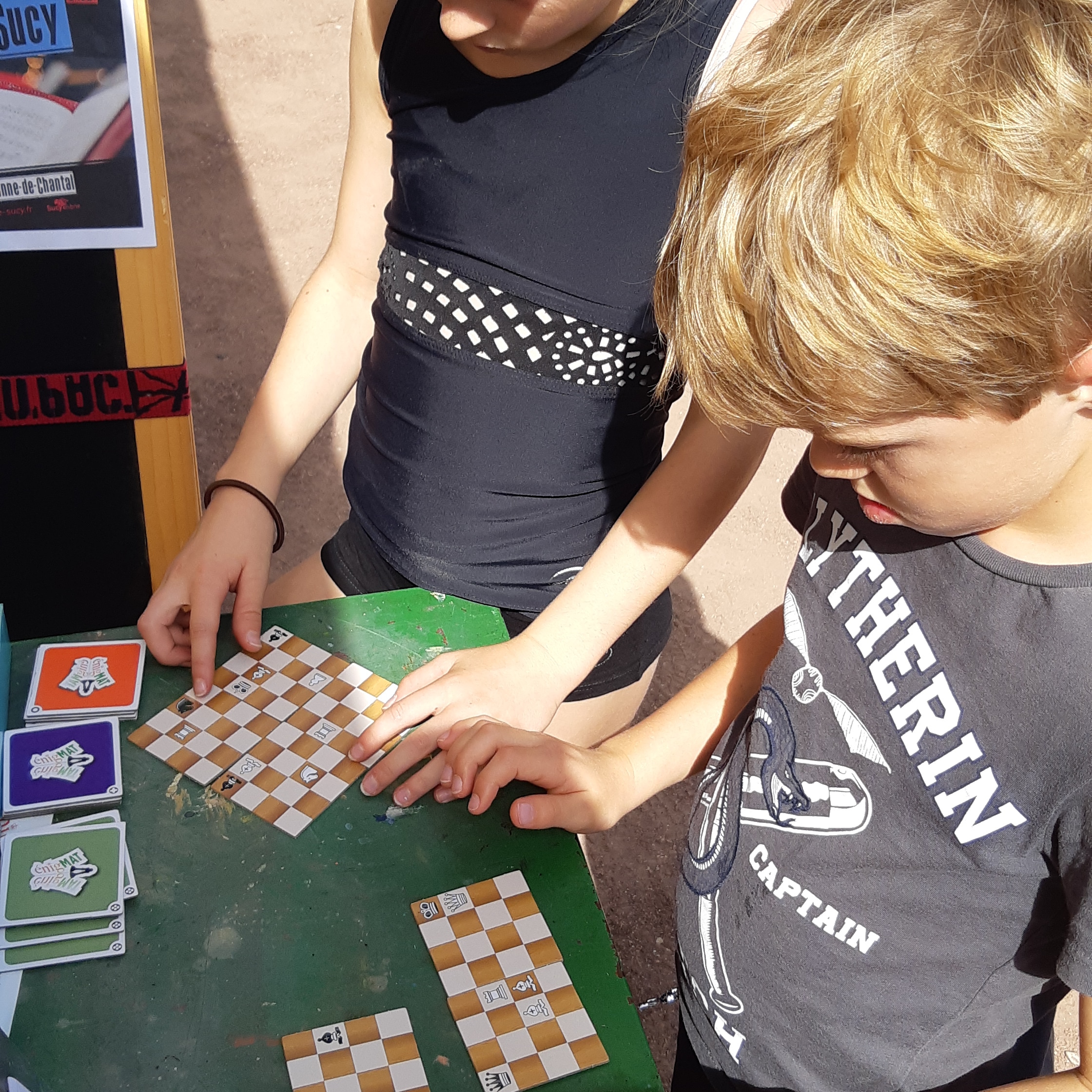 Quatre cartes représentent chacune un quart de l’échiquier avec des pièces blanches et noires que l’on devra orienter dans le même sens, Blanc étant en sud et Noir en nord. Ce sont les quatre pièces d’un puzzle représentant une situation de mat du Roi noir.