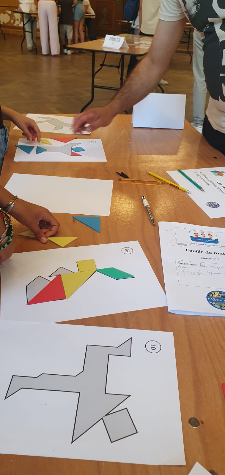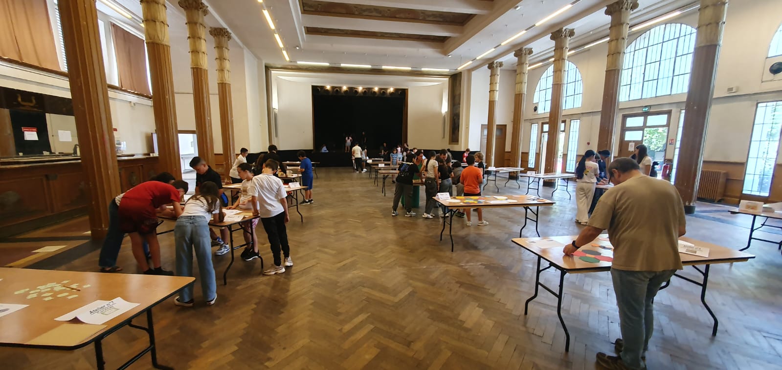 10 ateliers étaient proposés. Les élèves tournaient en autonomie, à l’aide d’une feuille route, sur les différents ateliers. Les consignes et le matériel étaient disposés sur les tables permettant une prise en main autonome et rapide. L’équipe de professeurs, la coordinatrice REP+ et la conseillère pédagogique circulaient en soutien des groupes, pour valider, pour remobiliser. Les parents les accompagnaient dans les groupes.