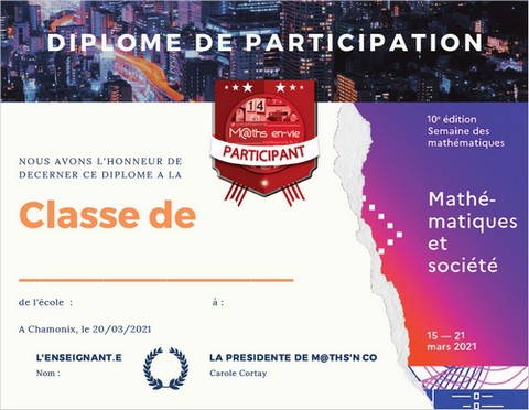 Toutes les classes peuvent si elles souhaitent participer au palmarès général qui sera publié sur le site M@ths en-vie (classement en fonction du % de réussite). Renseignez le formulaire ci-dessous afin de recevoir votre diplôme de participation au format imprimable à publier sur votre compte Twitter de classe, sur votre blog et/ou pour afficher dans la classe.