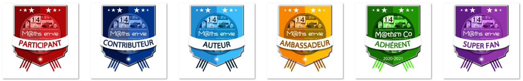 - Le badge Auteur est remis à tout.e enseignant.e ou formateur.trice qui a participé aux différentes publications M@ths en-vie chez notre partenaire Generation5, à savoir :