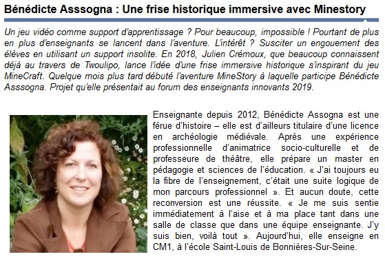 Un jeu vidéo comme support d’apprentissage ? Pour beaucoup, impossible ! Pourtant de plus en plus d’enseignants se lancent dans l’aventure. L’intérêt ? Susciter un engouement des élèves en utilisant un support insolite. En 2018, Julien Crémoux, que beaucoup connaissent déjà au travers de Twoulipo, lance l’idée d’une frise immersive historique s’inspirant du jeu MineCraft. Quelque mois plus tard débuté l’aventure MineStory à laquelle participe Bénédicte Asssogna. Projet qu’elle présentait au forum des enseignants innovants 2019.