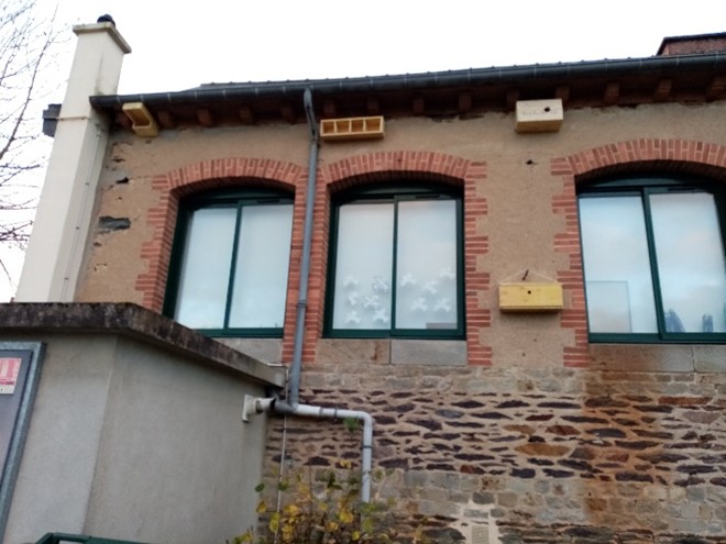 10/ Les 7 nichoirs sont suspendus sur le mur de l’école face au soleil levant et en hiver, avant la période de nidification.