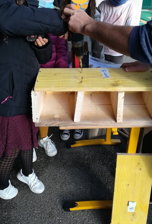 3/ Les élèves ont opté pour proposer aux oiseaux de la nourriture dans un autre lieu de l’école et par là même les amener à se déplacer et investir un autre espace. Mais il n’y avait pas de structures adéquates pour eux pour faire leurs nids (poutres), donc l’idée de faire des nichoirs est apparue.